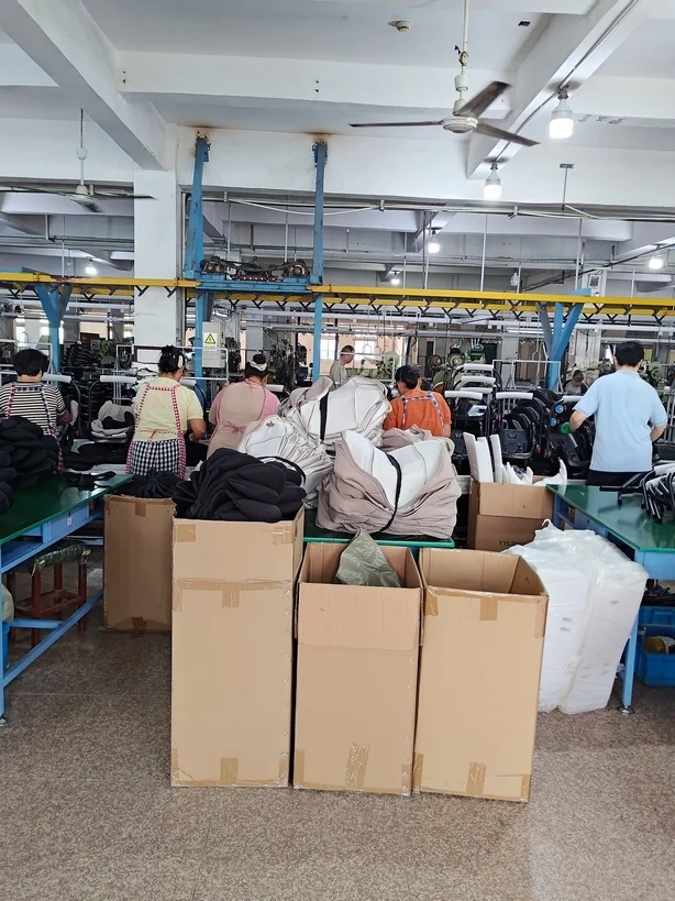 Материалы из цеха пошива, которые будут использоваться при производстве: матрасики, капюшоны, накладки на ремни.