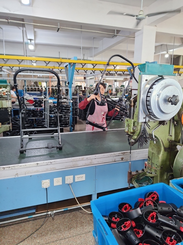 Установка колёс и динамичная отправка на дальнейшую сборку. Женщину, которая устанавливает корзины, вы уже могли видеть на первом фото.