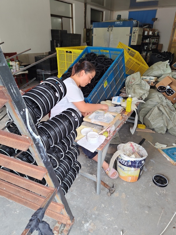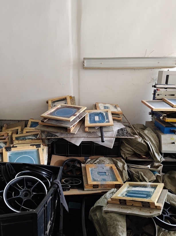 Колесо укладывается и через шаблон наносится рисунок. С рамами то же самое. Поэтому от того, насколько аккуратно трафарет подготовили, хорошую ли закупили краску, и выспалась ли женщина, зависит логотип торговой марки на готовом изделии.