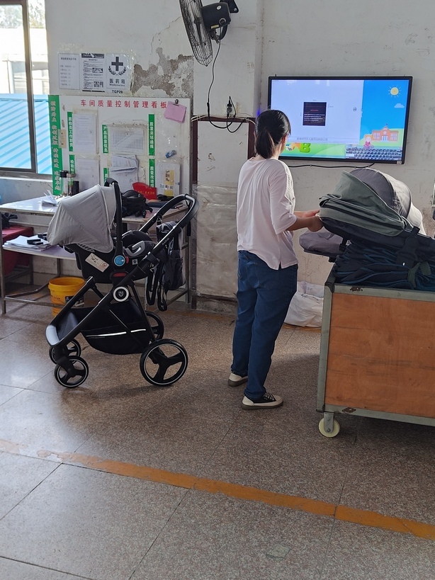 Несколько колясок/автокресел из каждой партии фабрика проверяет на соответствие качеству дополнительно: проверяют наличие маркировки, инструкций, важные для клиента функции. Делает это женщина чуть в стороне от линии сборки.